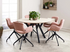 Et stilrent, rundt spisebord i skandinavisk design med fire solide ben, der giver både stabilitet og et minimalistisk udtryk. Bordet kombineres med fire moderne spisebordsstole i blød rosa farve, som tilføjer varme og personlighed til rummet.